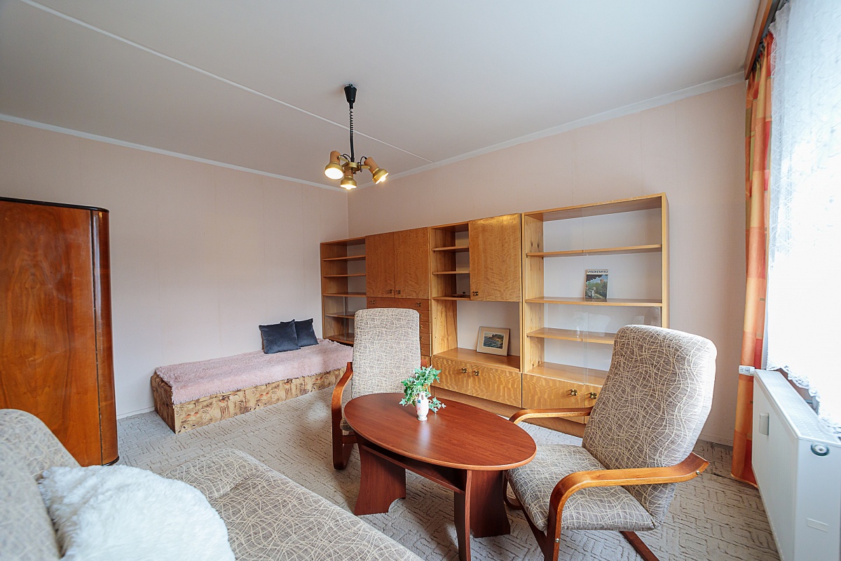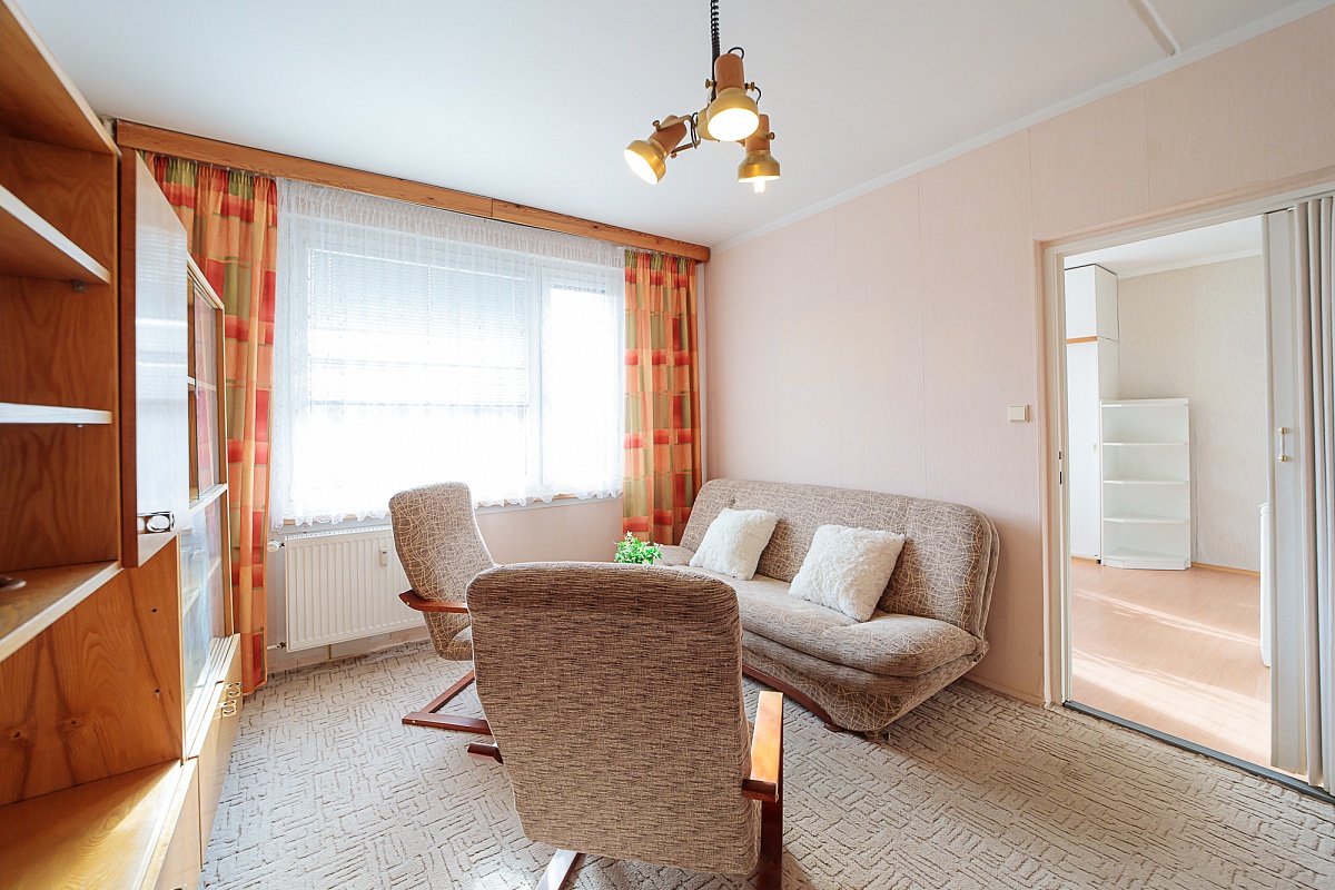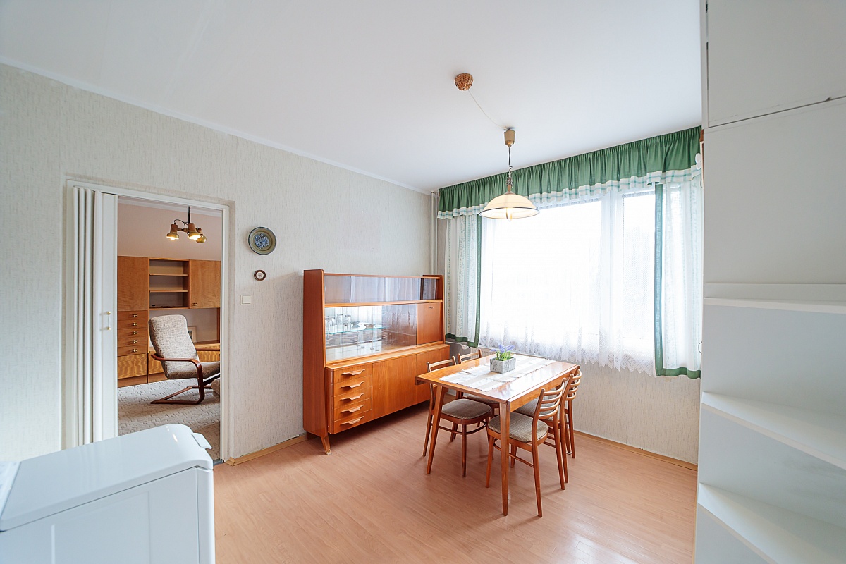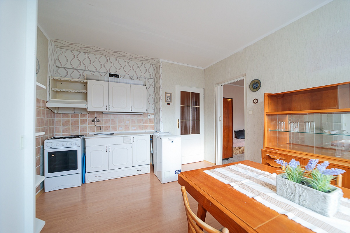 Byt je tvořen z jedné obytné místnosti, kuchyně s kuchyňskou linkou, koupelny a chodby. V koupelně je sprcha, umyvadlo a WC. Podlahovou krytinou je lino, koberec a dlažba. V bytě jsou již plastová okna. K bytu patří i sklepní kóje.