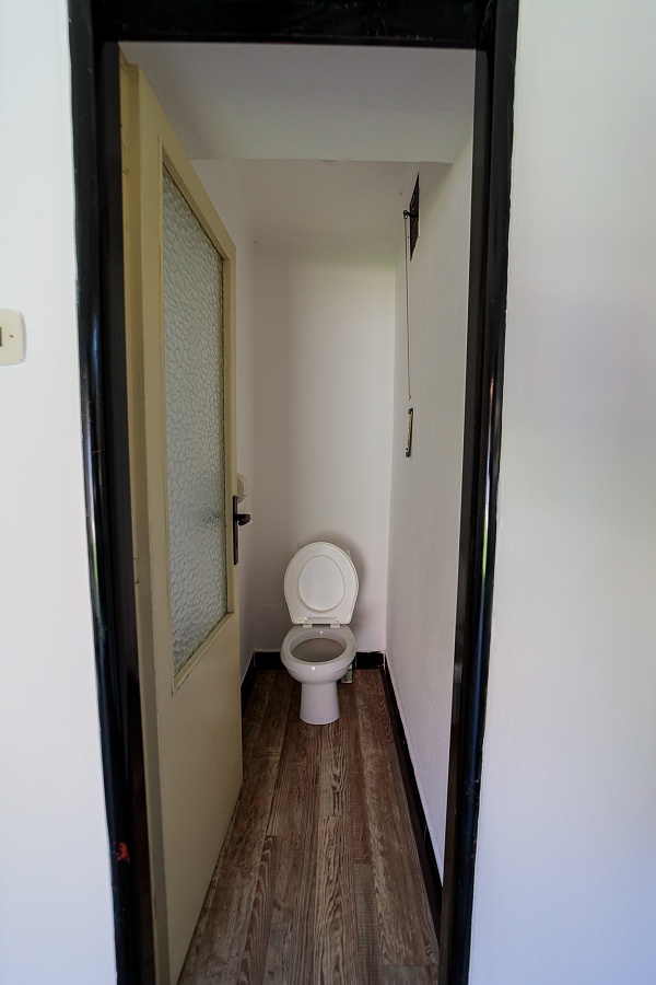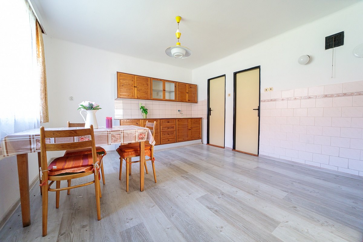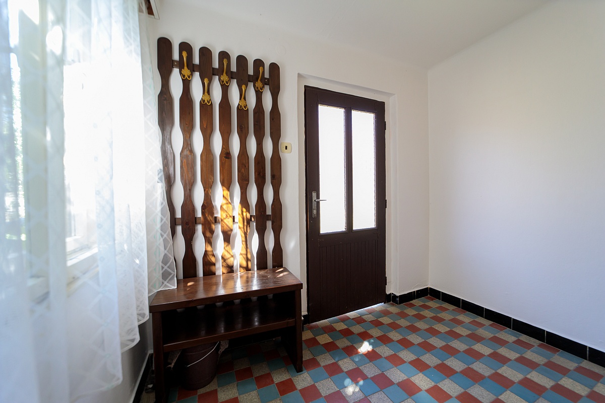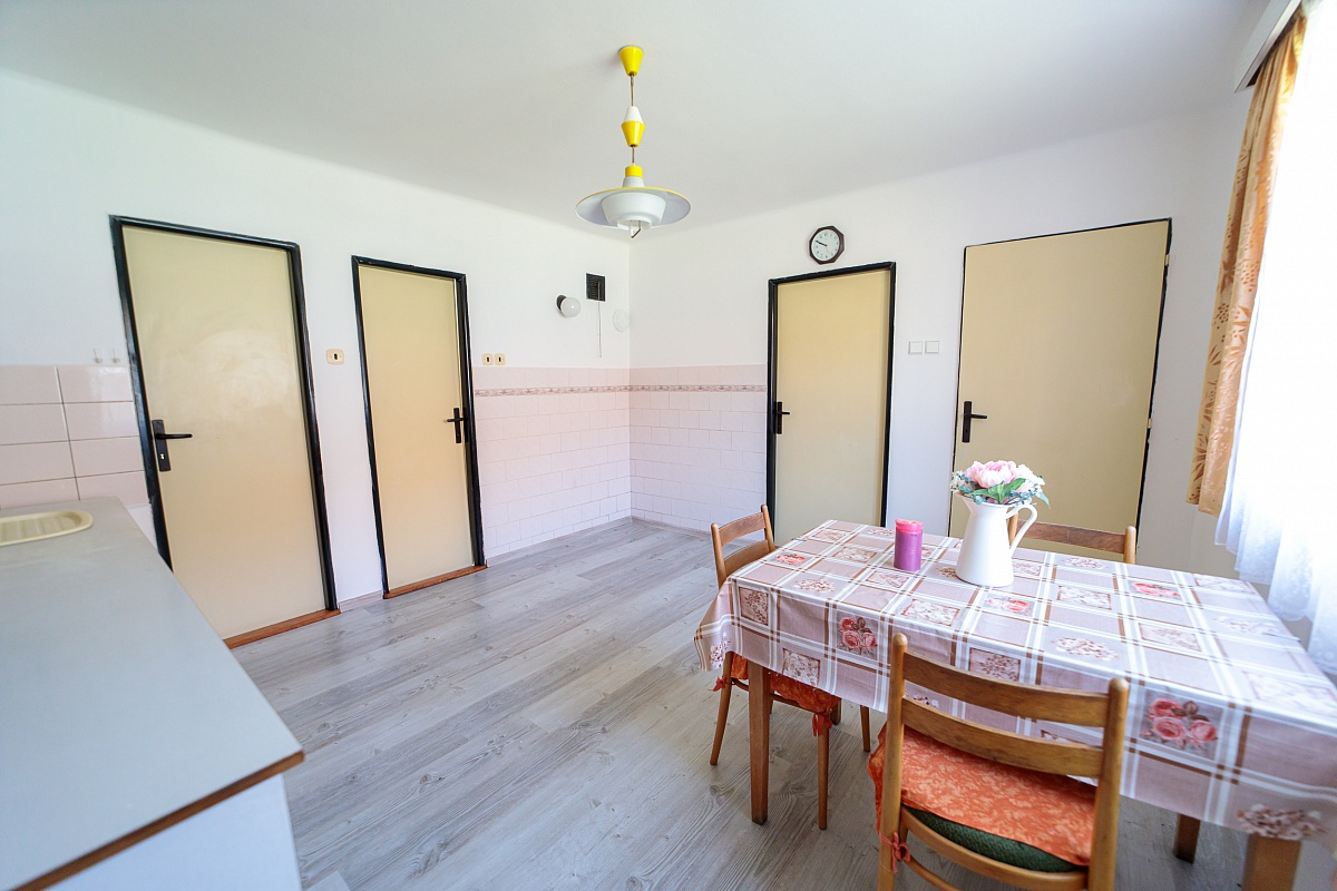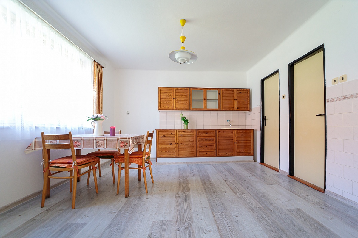 V přízemním domě je k dispozici vstupní veranda, ze které vede vstup na samostatné WC, nebo do chodby. Chodbou se dále dostanete do obývacího pokoje a kuchyně, tyto dva pokoje mají i dveře mezi sebou. Z kuchyně je pak vchod do spíže a koupelny s vanou. Podlahová krytina je lino a dlažba. Dveře a okna jsou dřevěná.