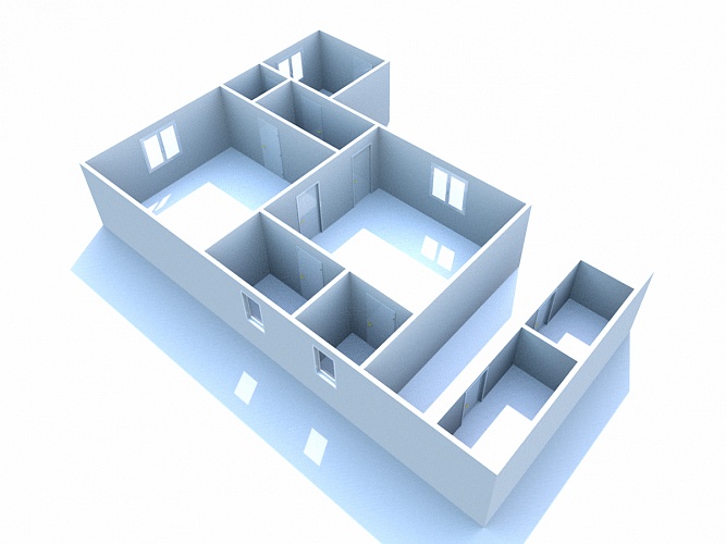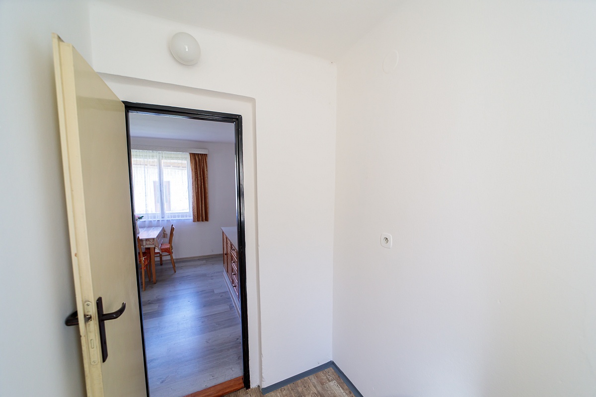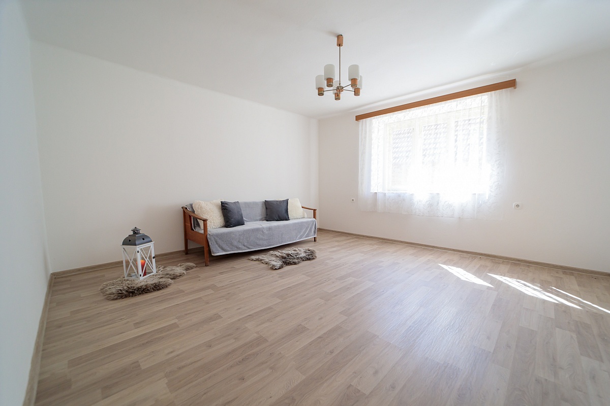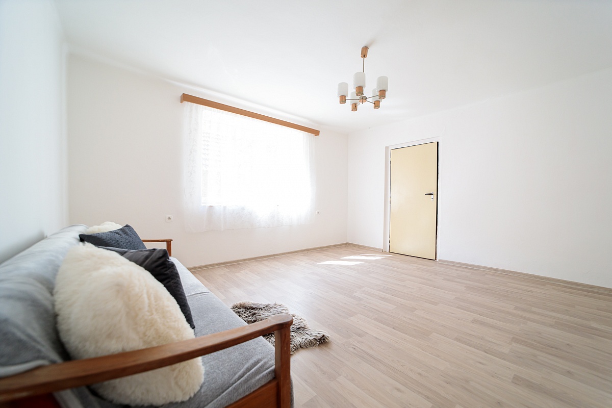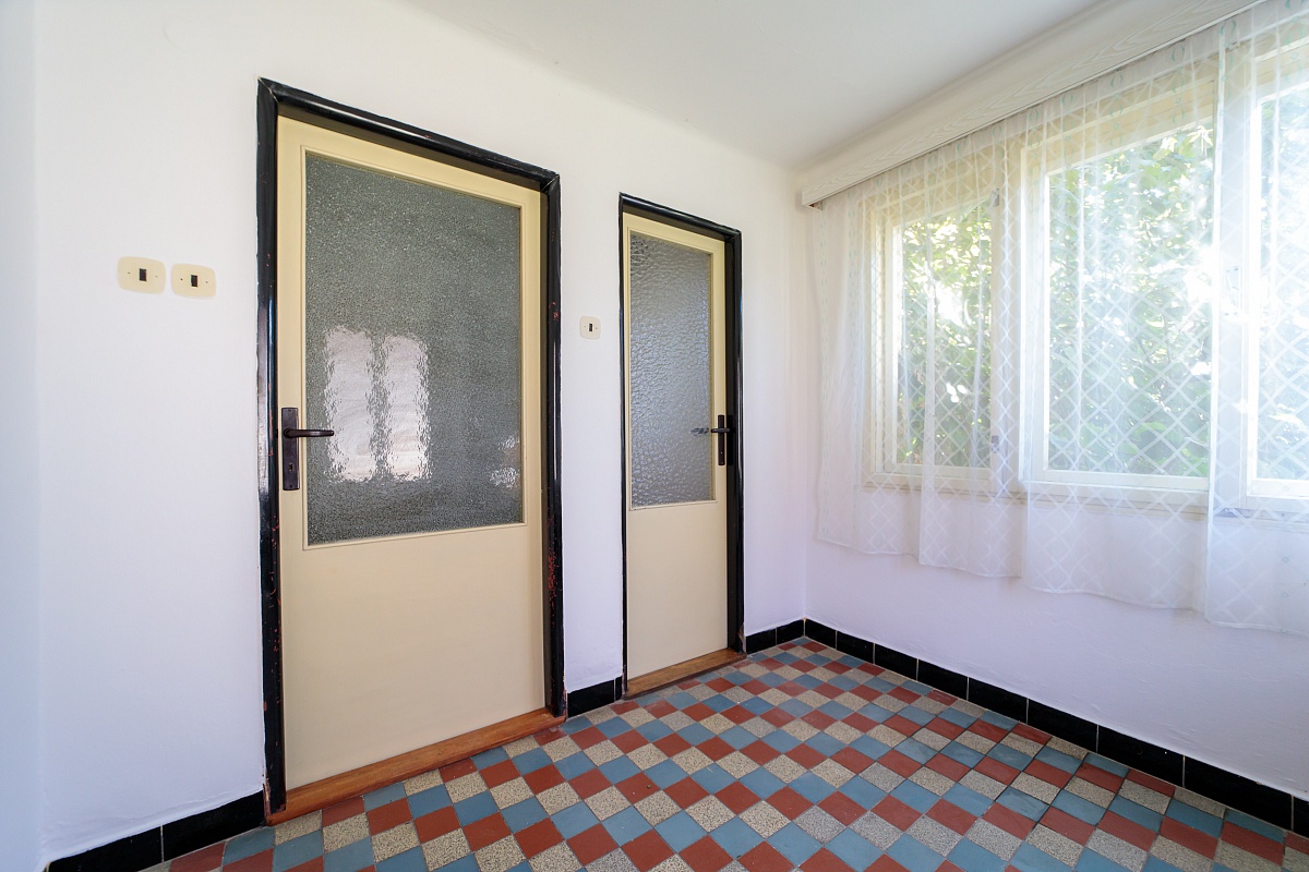 V přízemním domě je k dispozici vstupní veranda, ze které vede vstup na samostatné WC, nebo do chodby. Chodbou se dále dostanete do obývacího pokoje a kuchyně, tyto dva pokoje mají i dveře mezi sebou. Z kuchyně je pak vchod do spíže a koupelny s vanou. Podlahová krytina je lino a dlažba. Dveře a okna jsou dřevěná.