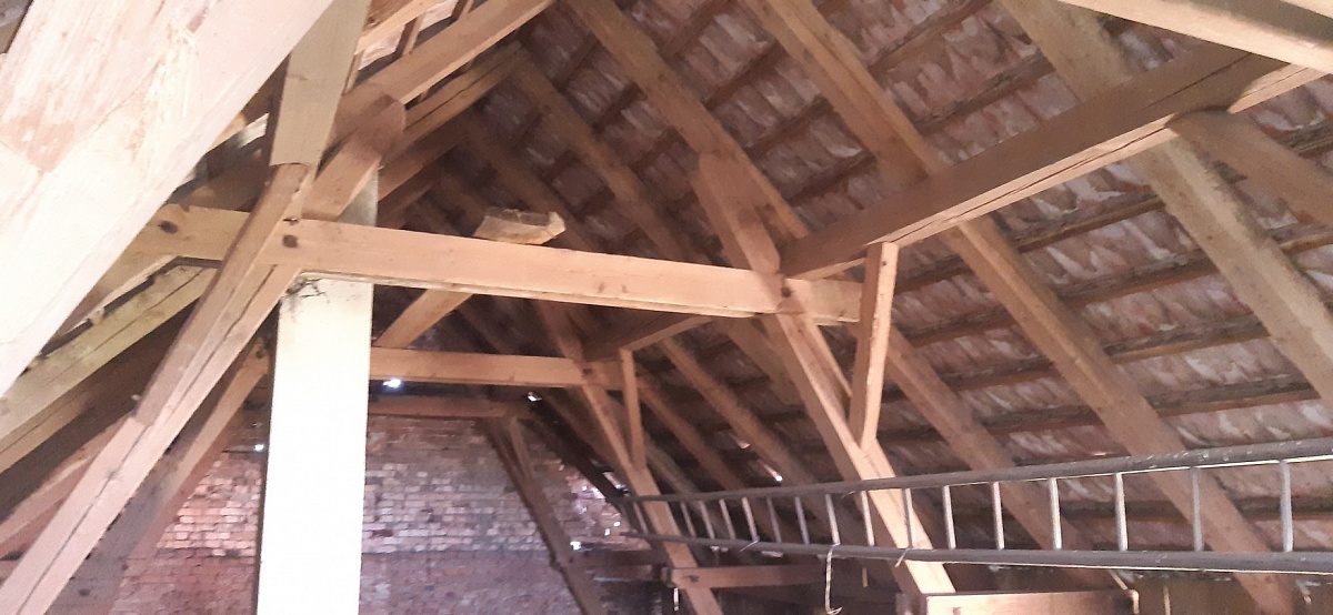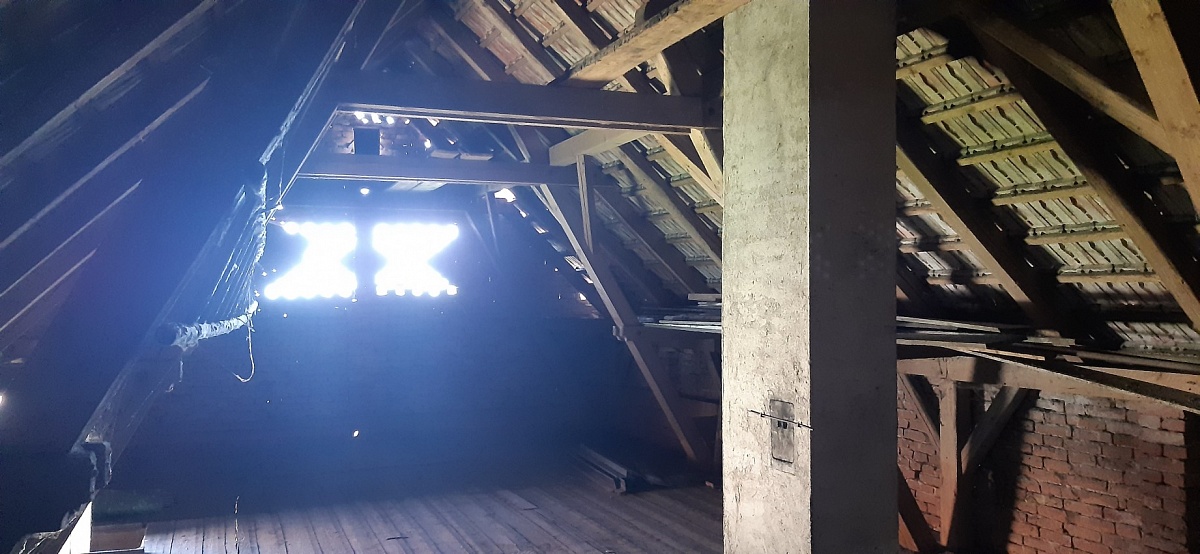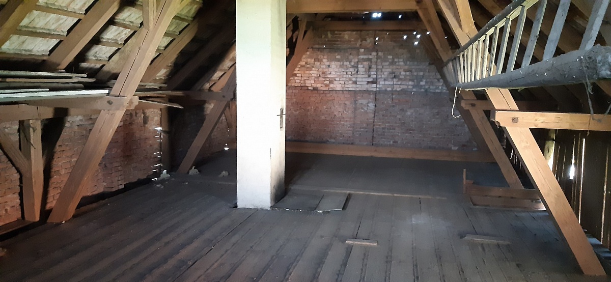 Dům má velké půdní prostory, kde je možnost půdní vestavby. Střecha je sedlová z pálených tašek.