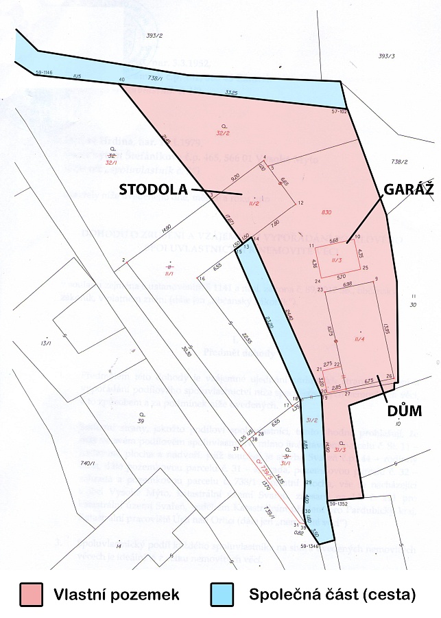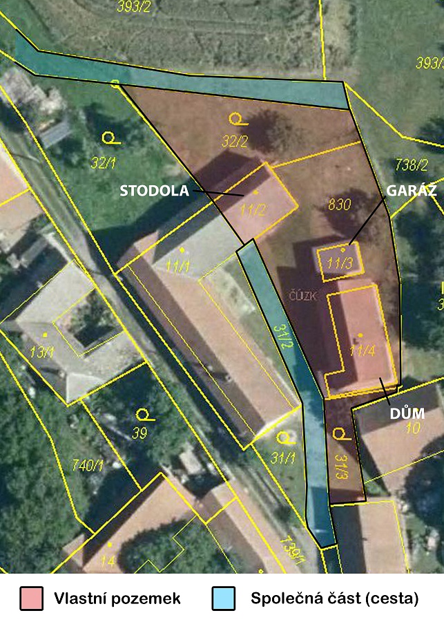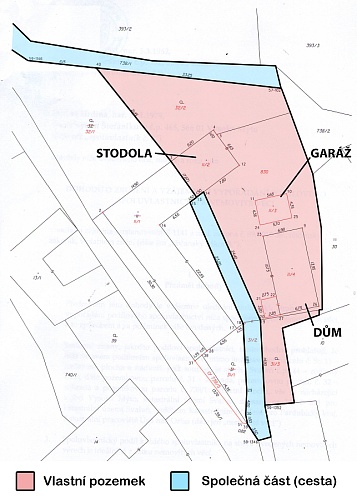 K domu vede společná cesta pro sousední dům. Na konci pozemku je ještě jedna společná příjezdová cesta z druhé strany objektu.