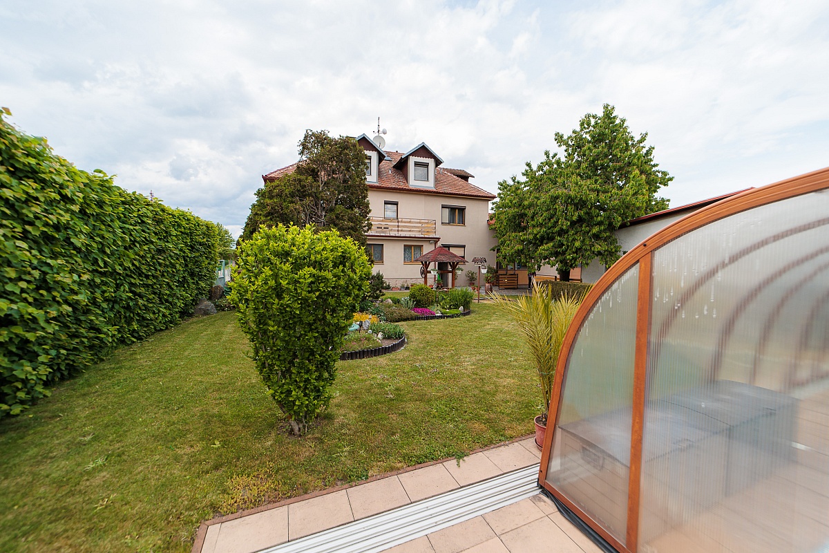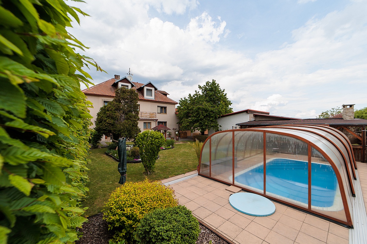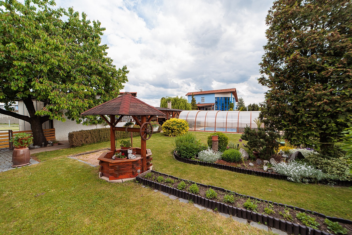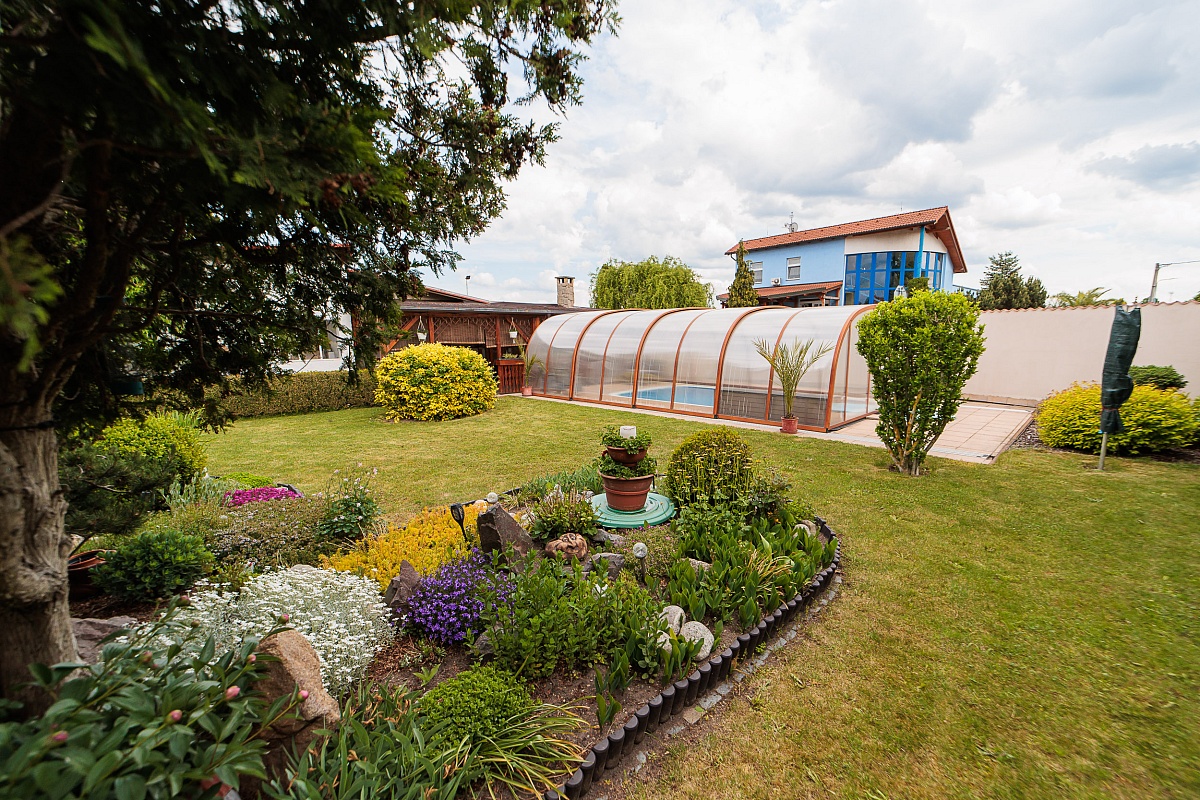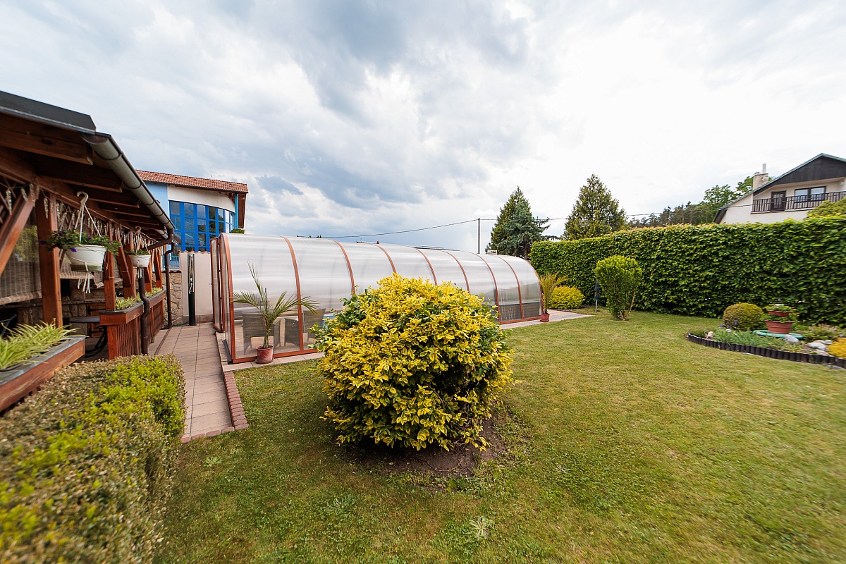 Velkou předností je pečlivě udržovaná zahrada, kde nechybí jak krytý bazén, tak i krásná pergola s krbem a letní kuchyní. Je zde také dostatek prostoru pro pěstování ovoce a zeleniny. Vysoký plot vám zajistí odpočinek v naprostém soukromí. Dvůr vydlážděn žulovými kostkami a je zde dostatek místa pro parkování. Nechybí tu zkrátka vůbec nic.