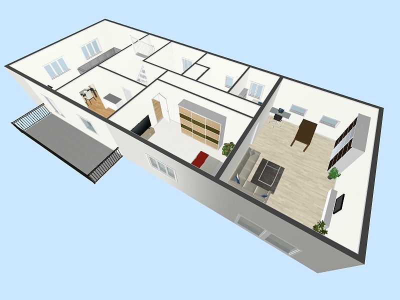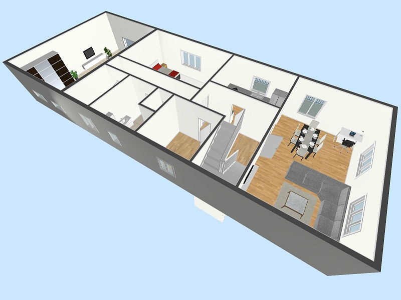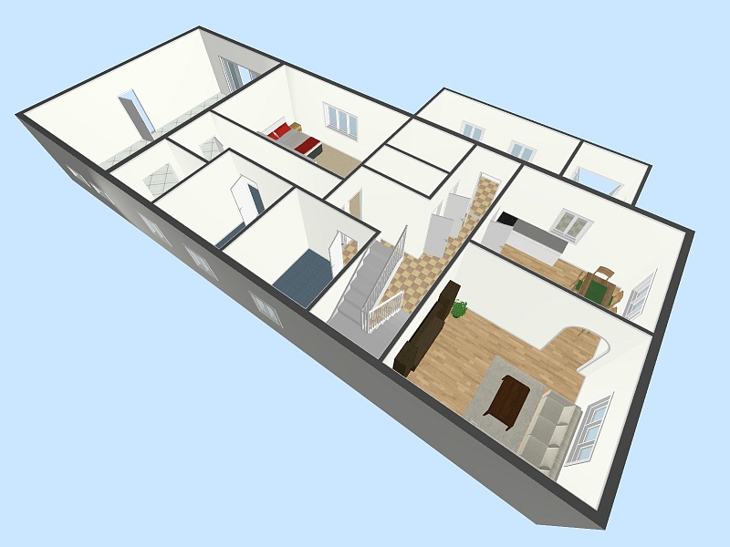 Rodinný dům má bytové dispozice 2+kk, 4+1 a 3+1. V přízemí se nachází bytová jednotka 2+kk, komora, spíž, prádelna a kotelna. Je zde také komerční část domu – velká místnost se zázemím pro zákazníky, tři dílny, velký sklad a kotelna. V 1.NP se nachází bytová jednotka 4+1 s prostornou terasou, chodba, koupelna, samostatná toaleta a spíž. V podkroví domu je atypická bytová jednotka 3+1 s klimatizací, chodba, koupelna, samostatná toaleta a komora.